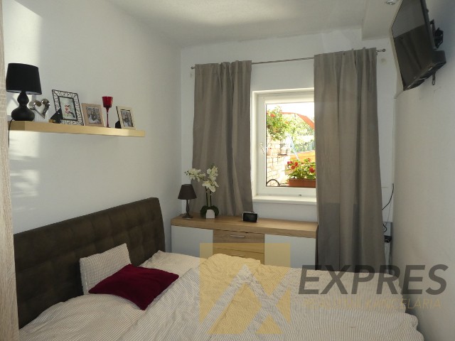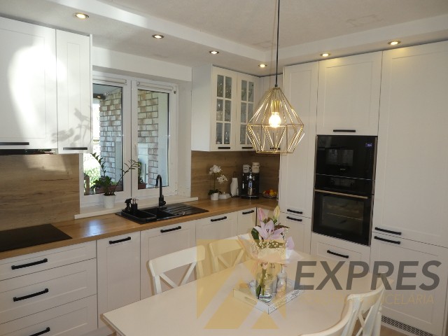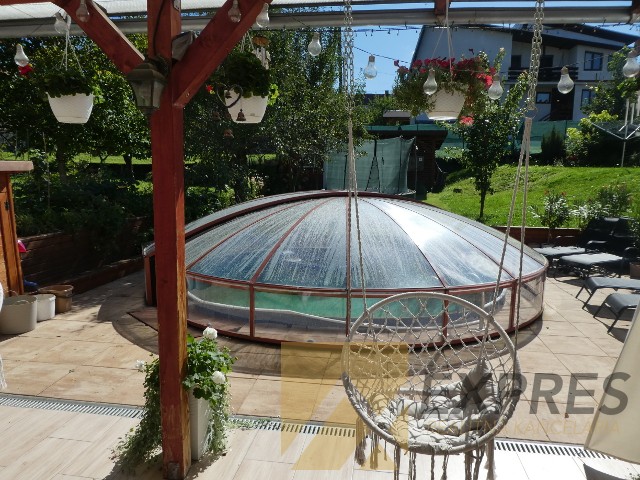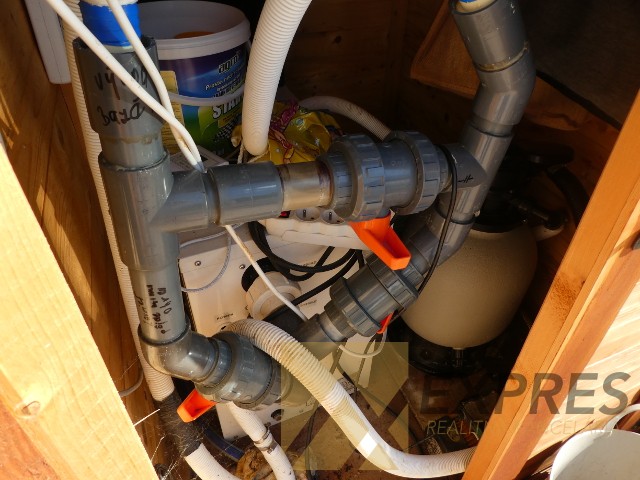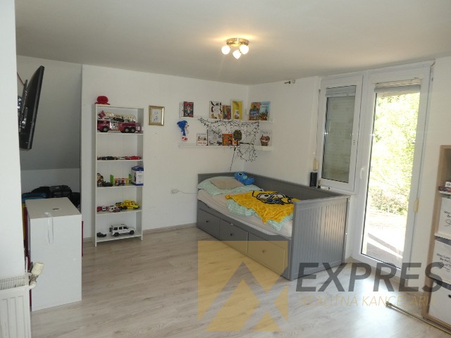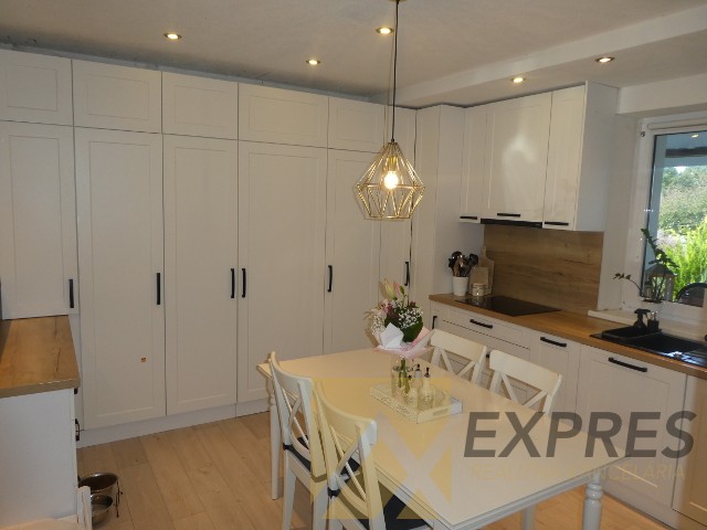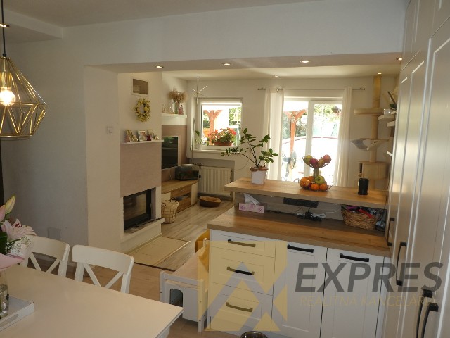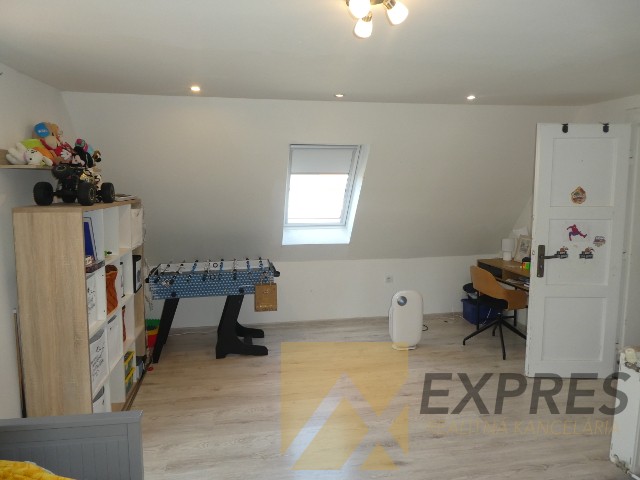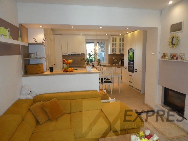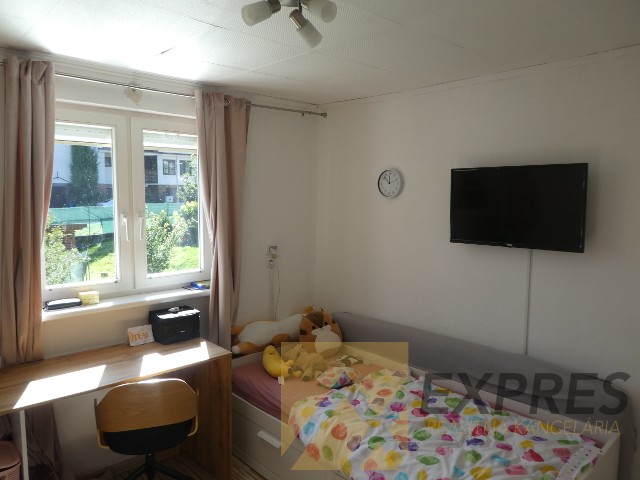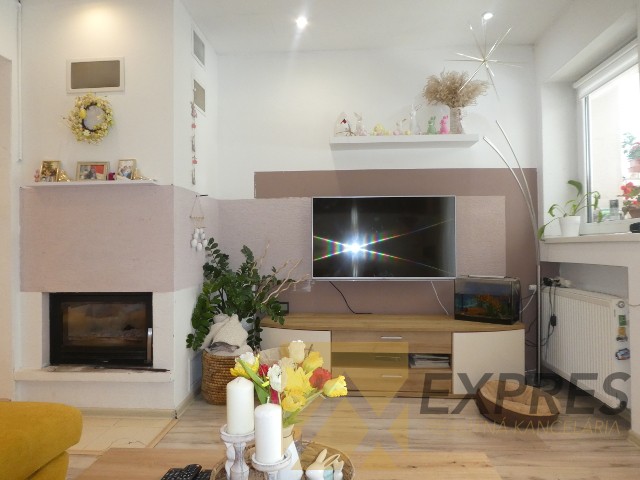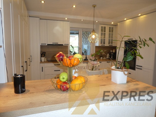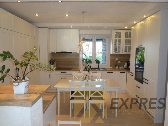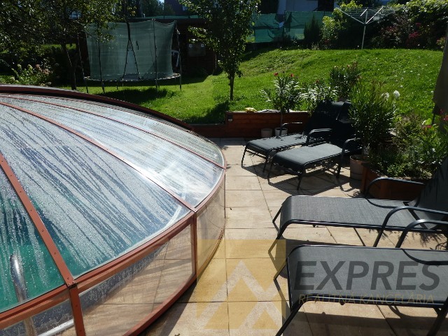Realitná kancelária EXPRES Vám EXKLUZÍVNE ponúka na predaj rodinný dom, ktorý tvorí časť dvojdomu a nachádza sa v zastavanom území mesta Handlová, vo vyhľadávanej lokalite, na ulici Údernícka. Rodinný dom je čiastočne podpivničený a má dve nadzemné podlažia. Napojený je na rozvod plynu, elektrickej energie, verejný vodovod a odkanalizovaný do verejnej kanalizácie. Na 1.NP sa nachádza veranda, chodba so schodiskom, kuchyňa otvorená s obývačkou s novou kuchynskou linkou (umývačka, chladnička, mikrovlnka, rúra, indukčná varná doska, digestor), v obývačke sa nachádza krb s prieduchami do všetkých izieb, ďalej sa nachádza spálňa, kúpeľňa so sprchovacím kútom a vaňou, samostatné WC a garáž. Z obývačky je vstup na priestrannú terasu so sedením. Na 2.NP sa nachádzajú dve izby. V pivničných priestoroch je práčovňa a kotolňa. Základy sú betónové s izoláciou, nosné murivo z pálenej tehly, deliace konštrukcie murované z tehál, stropy drevené trámové, krov väznicový sedlový s novou krytinou, vonkajšie dvere a okná plastové, podlahy laminátové plávajúce a keramické dlažby, príprava TÚV a vykurovanie ústredné teplovodné kotlom na plyn, v letných mesiacoch príprava TÚV je slnečnými kolektormi (marec až október). Prístup k rodinnému domu je z miestnej asfaltovej cesty. Na rovinatom slnečnom pozemku o celkovej výmere 683 m2 sa nachádza krytý bazén s tepelným čerpadlom a filtráciou a sklad na náradie a drevo.